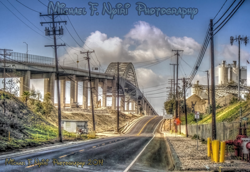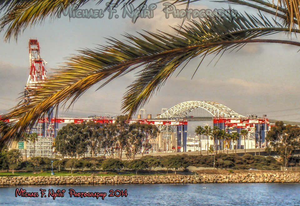 View from Water Street of the "old" Gerald Desmond Bridge across Terminal Island to Long Beach photographed 10-19-2014