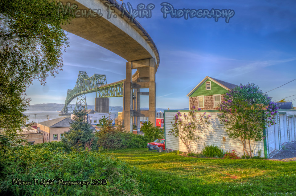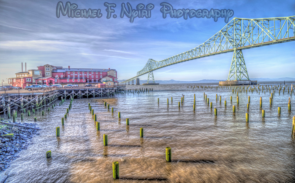 The Astoria-Megler Bridge and the Cannery Hotel and Spa on the Astoria Pier in Astoria, OR.